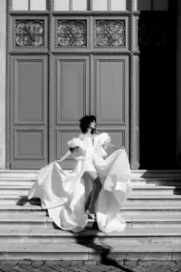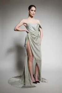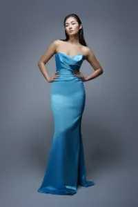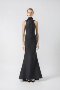 Athena is a black glitter gown with a low, soft cowl neckline and a flowing mermaid train. Backless and elegantly draped, this classic design creates a show-stopping silhouette that blends timeless glamour with refined sophistication.