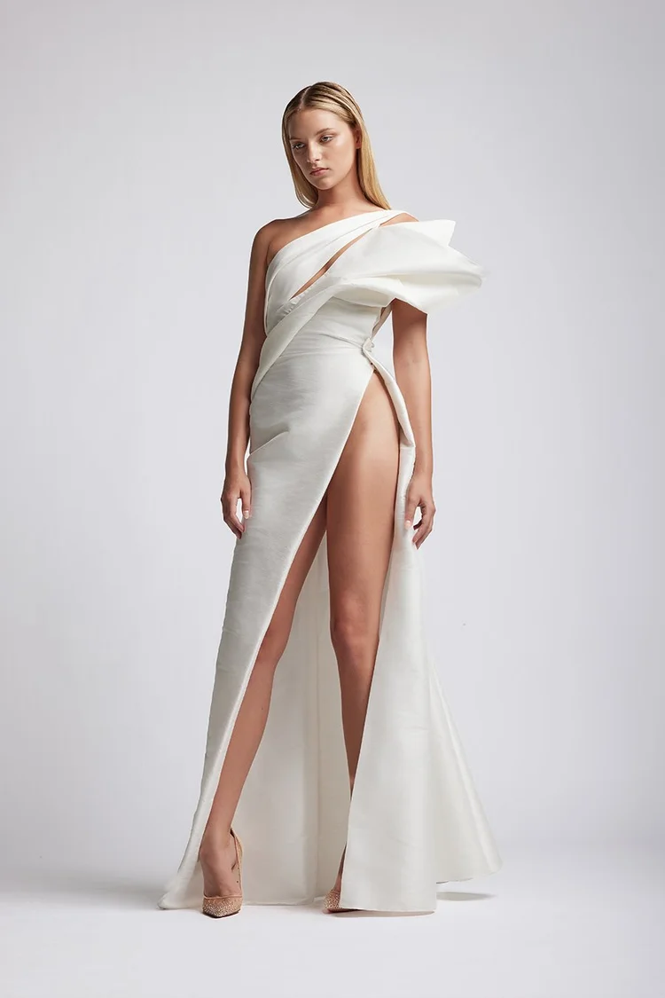 This one-of-a-kind designer gown features a sculptural diagonal drape across the body, with a signature asymmetrical bust cut-out that elegantly reveals the left shoulder. A fusion of classic one-shoulder silhouette and avant-garde structure, the design makes a bold red carpet statement.